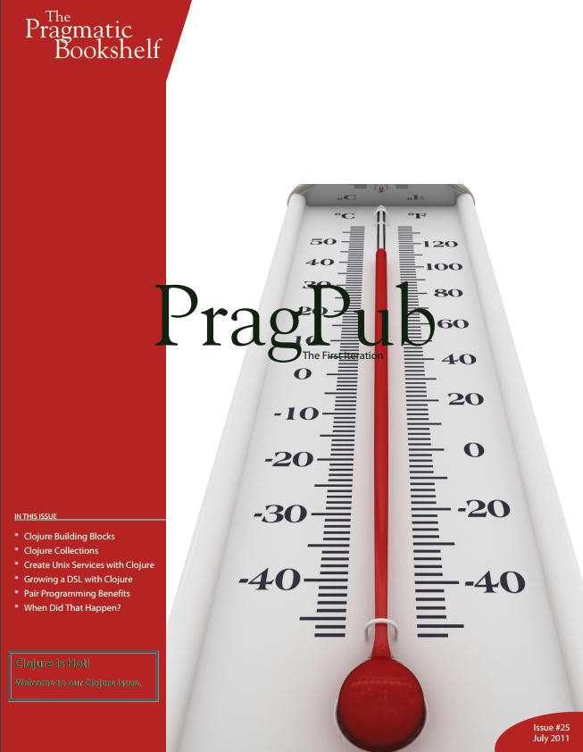 Vydavatelství The Pragmatic Bookshelf — které svého času založili někdejší signatáři Manifestu agilního vývoje softwaru Andy Hunt a Dave Thomas — vydává (zdarma) příjemný časopis, měsíčník PragPub. Aktuální červencové číslo se věnuje převážně Clojure. Jsou zde mmj. články o neměnnosti dat a kolekcích, nebo o DSL.