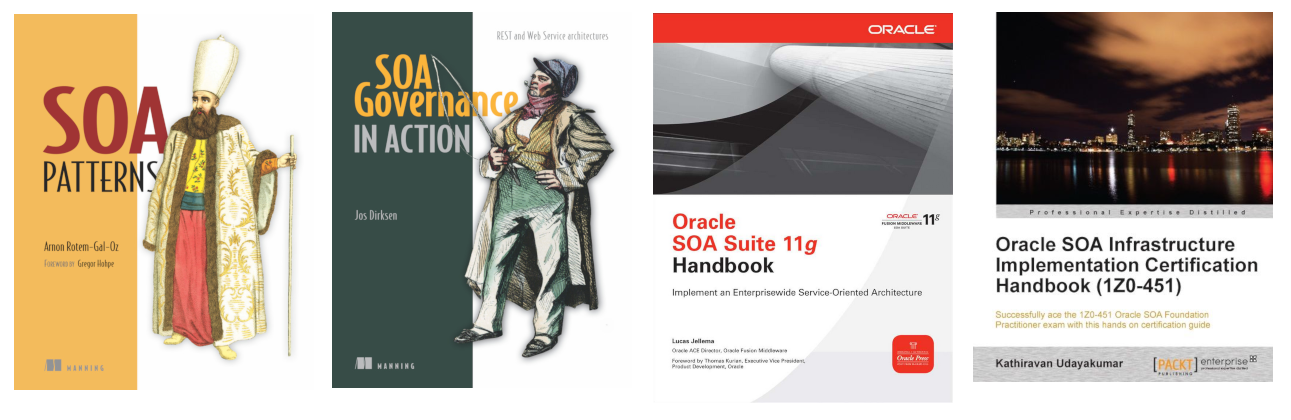 - Oracle SOA Suite 11g Handbook — 800stránková bichle na téma “co všechno jste chtěli vědět o SOA Suite, báli jste se zeptat a na školení vám to neřekli”. Knihu rozhodně doporučuji jako kvalitní zdroj k danému tématu.