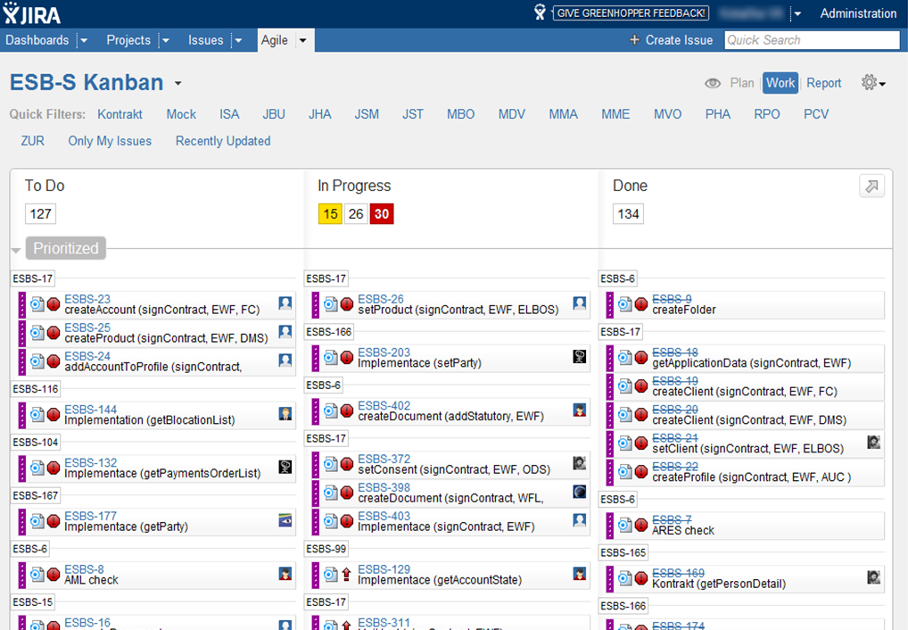 Elektronický Kanban board (JIRA plugin GreenHopper (nyní JIRA Agile))