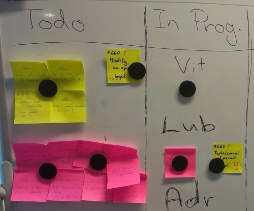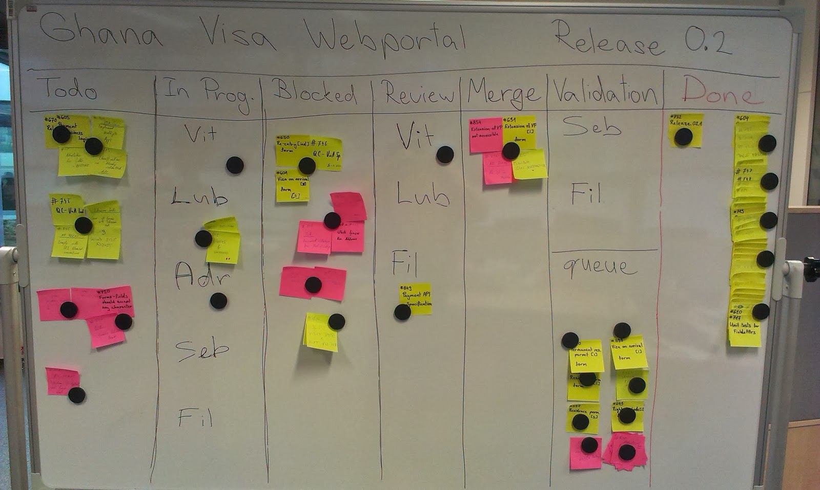 Je lepší použít fyzický, nebo elektronický Kanban board? Záleží na kontextu. Fyzický se dobře vyjímá v openspacu a dobře se před ním dělají stand-up meetingy. Pozitivní psychologický efekt je, že board je vidět neustále a tak každý člen týmu (i náhodný kolemjdoucí manažer) mají okamžitý přehled o stavu projektu. I z osobní zkušenosti (pokud to jde) doporučuji použít fyzický Kanban board.