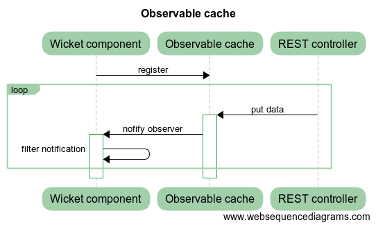 - Wicket komponent se zarigistruje jako observer do observable cache.
