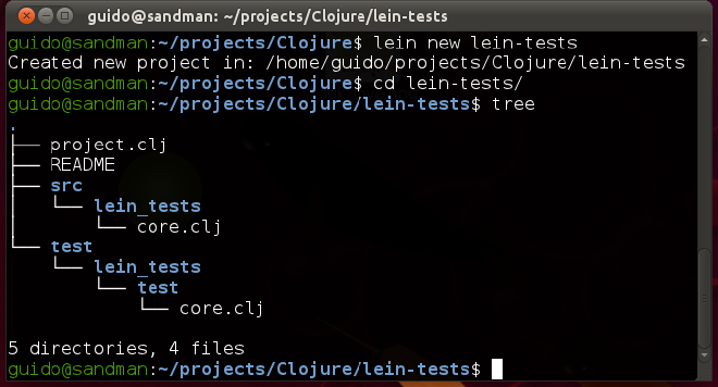 Tak. Konec srandiček! Velký kluci buildujou (a spouští testy) Leiningenem. Prvně vytvoříme projekt příkazem lein new lein-tests: