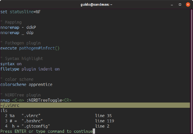 .vimrc, .bashrc a .gitconfig. Kromě toho, že ukazuje na kterém